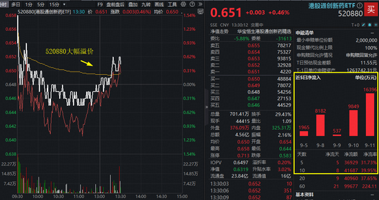 值得关注的是,港股通创新药ETF(520880)晋级“100%创新药研发”标的后,资金面逾益火热,场内连续获资金净申购。昨日利空传闻引发创新药剧烈波动,超1.6亿元资金大举“抄底”,今日盘中延续宽幅溢价,买盘尤为充沛。